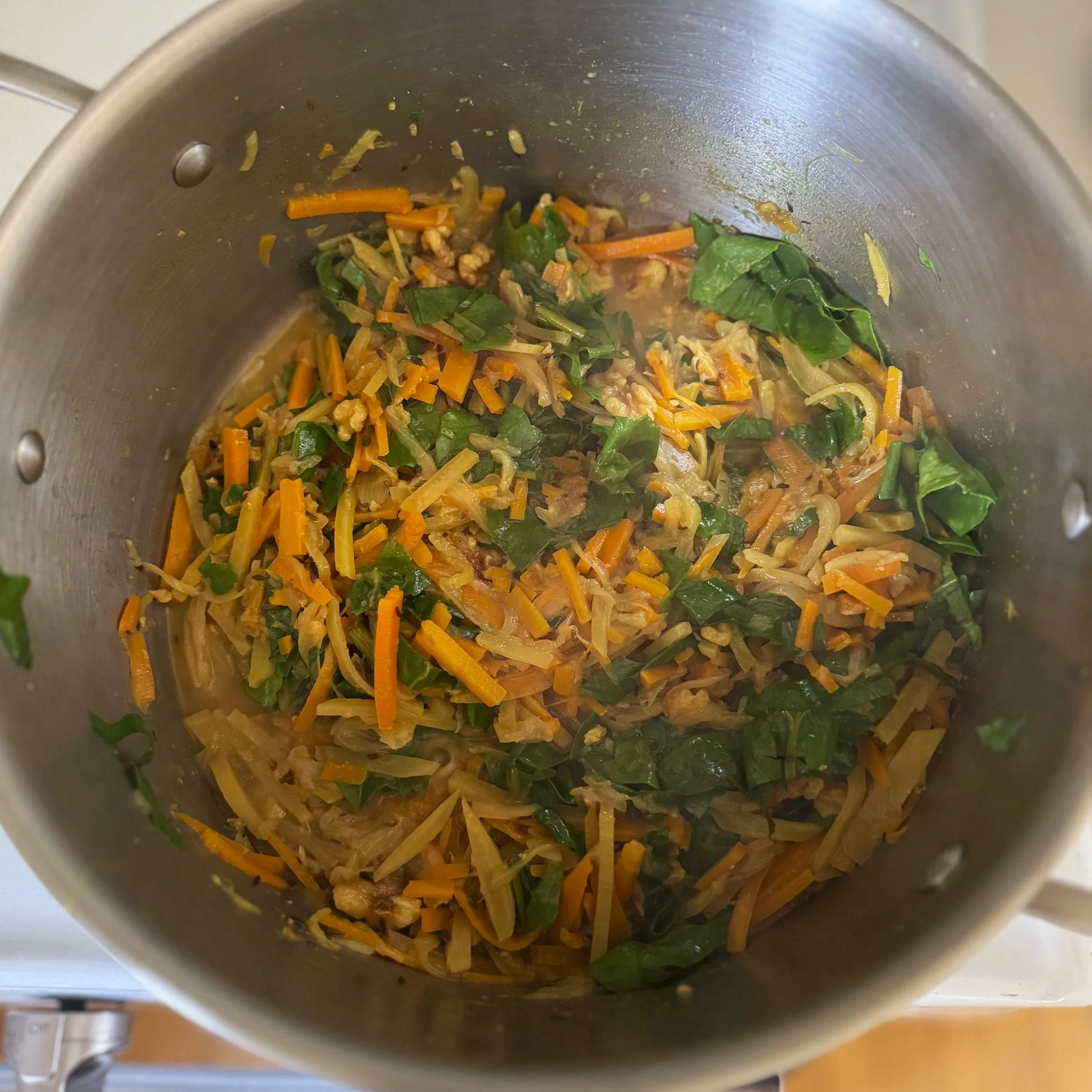 Stir in the beet greens (or spinach) and simmer another 1-2 minutes until tender.