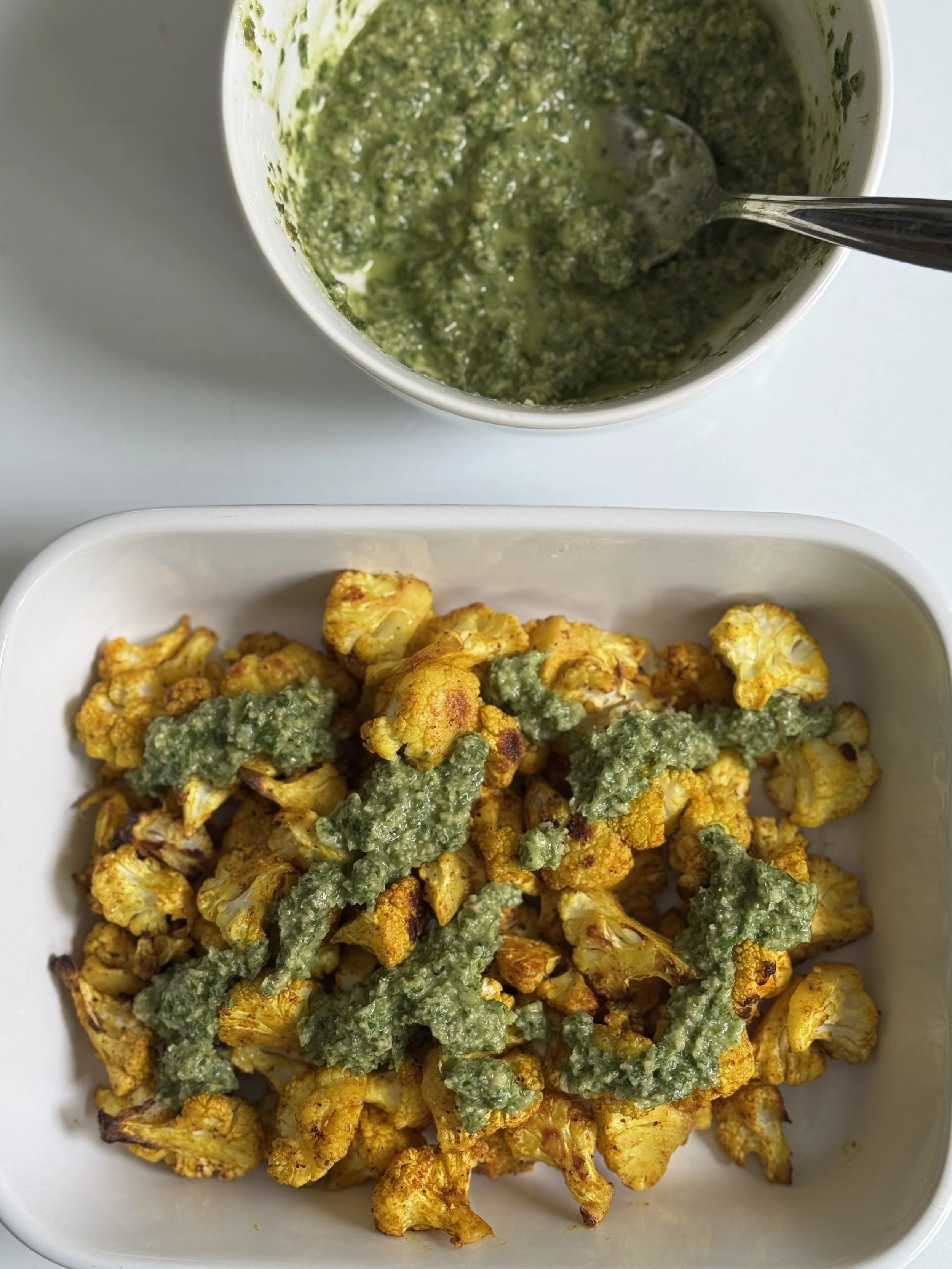 The herb blend we used for ours here is 1 ½ cup celery leaf, 4 tablespoons oregano and 2 tablespoons thyme leaf. Served on turmeric chili roasted cauliflower.