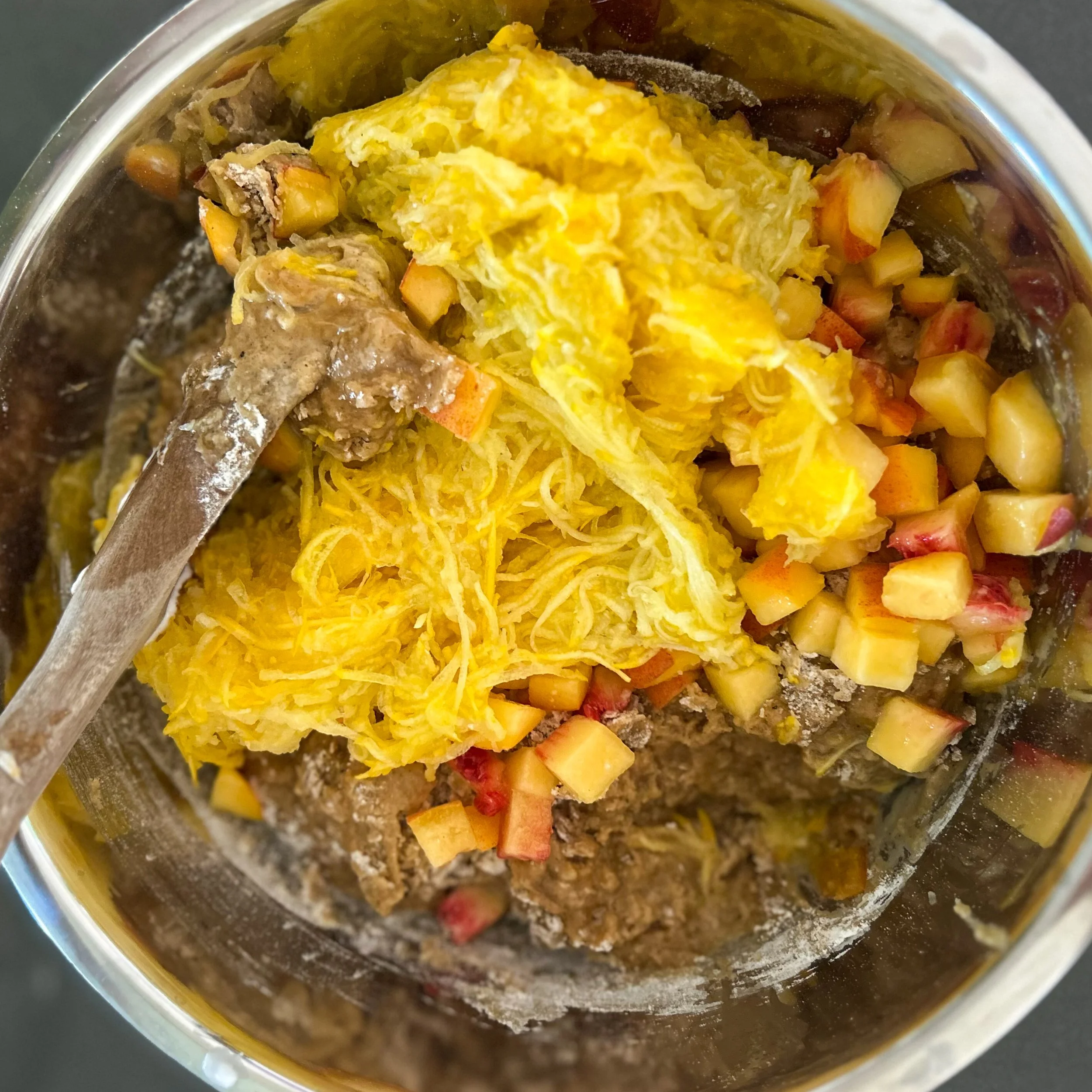 Fold the wet ingredients into the dry ingredients until just combined then fold in the grated squash and peaches.