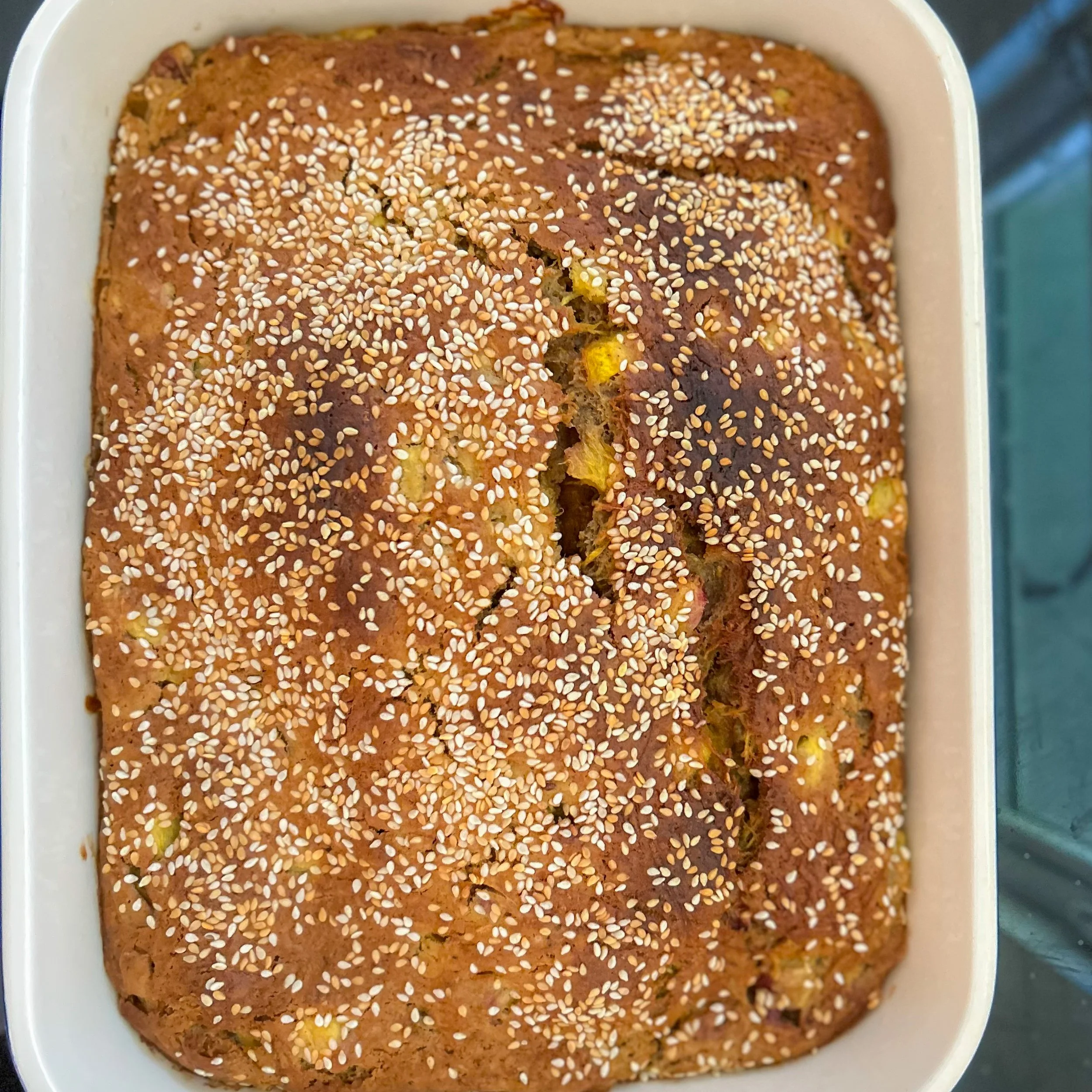 Pour the batter into the baking pan. Sprinkle the sesame seeds on top.