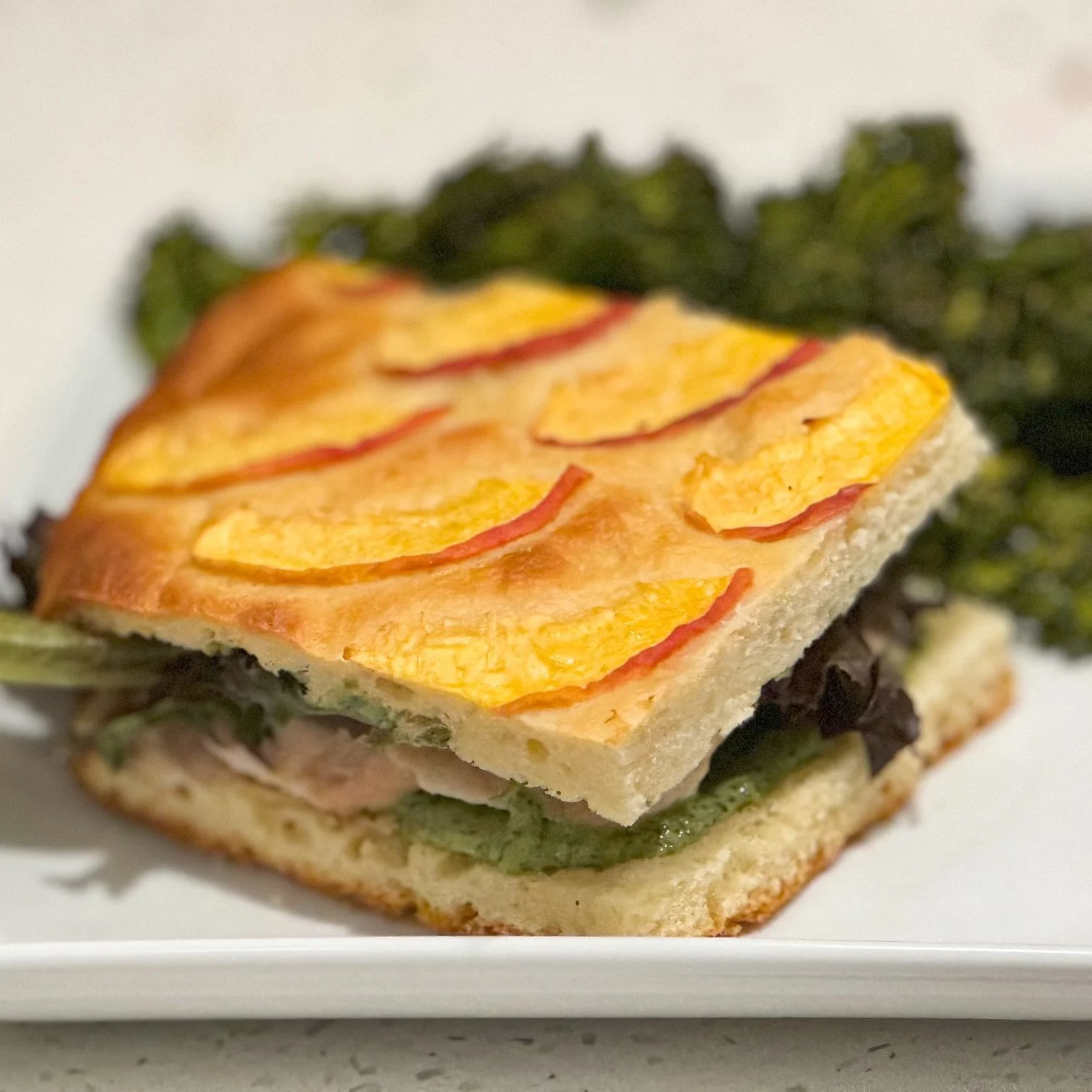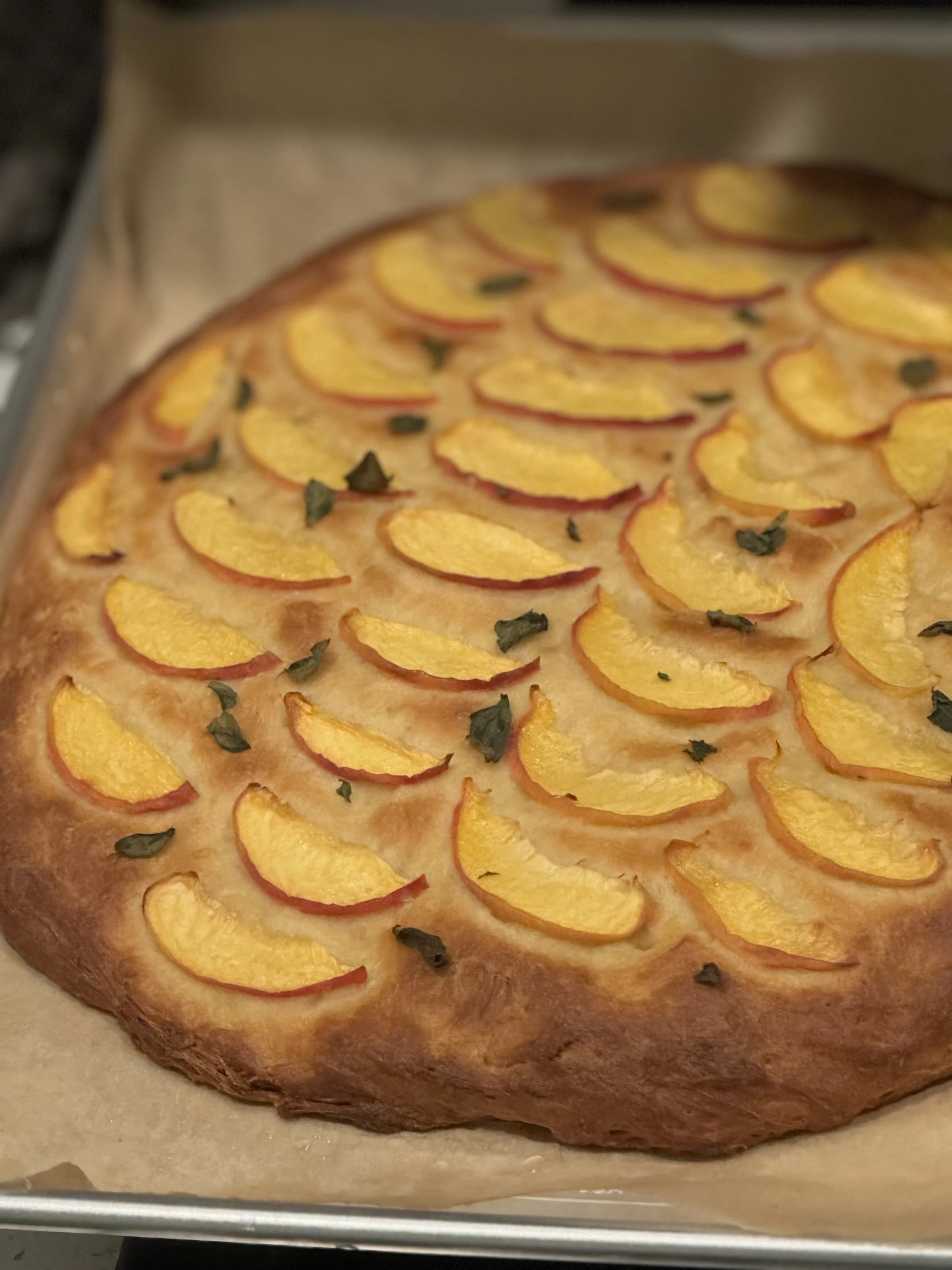 Drizzle the top with the remaining 2 tablespoons of olive oil. Without deflating the dough, use your fingers to make dimples all over the surface. Gently top the dough with the peaches and thyme.