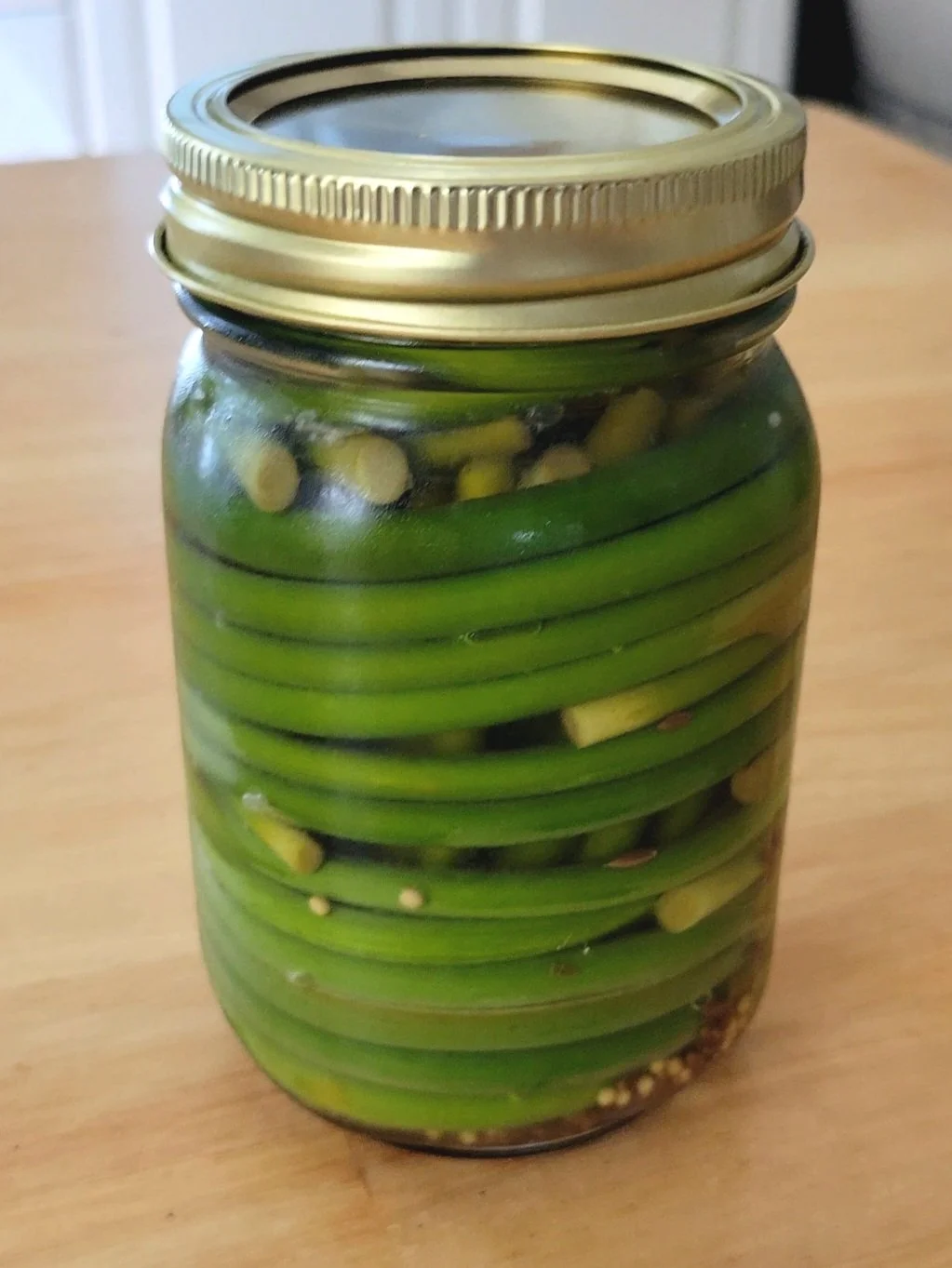 Blanch the scapes and allow to cool. Cut them to fit the jar.